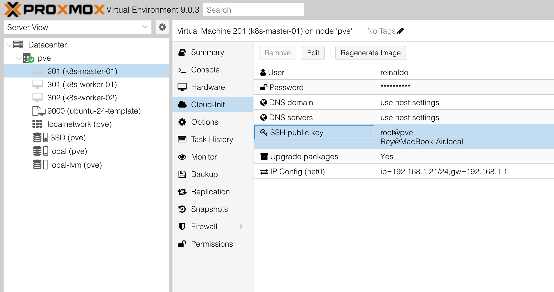 Since I use an Ubuntu Cloud-Init image to clone new virtual machines, I set up my SSH keys to ensure seamless access. By doing this, I eliminate the need for credentials when connecting to each new host. We will soon publish an easy tutorial here on the website detailing the process of creating a template with Cloud-Init for Ubuntu.